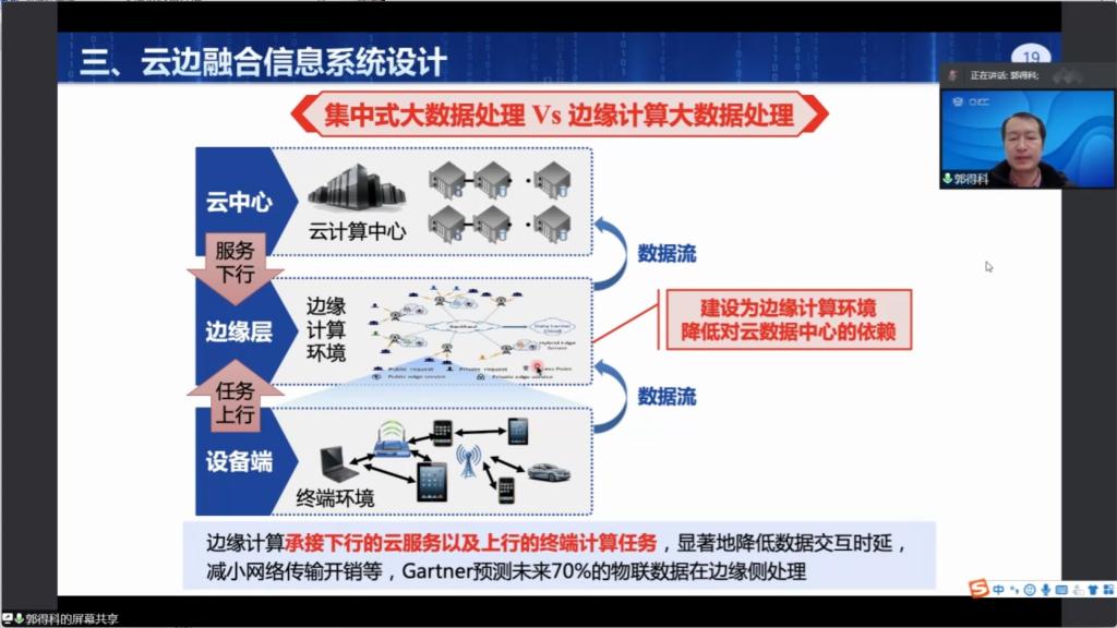 郭得科教授围绕“云边融合信息系统新型架构”的主题,系统介绍了网络计算模式从C/S、P2P、网格计算、云计算,再到边缘计算的演变路径,深入分析了云网融合与云边融合信息系统设计中遇到的新的科学问题及解决方向,并重点介绍了边缘计算联盟架构、公有私有混合边缘计算架构,以及移动和固定边缘节点的协同架构。